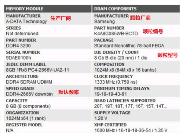 7、随后会显示内存条的各项信息,可以看到内存颗粒的厂商为三星,颗粒型号为bdie,型为“K4A8G085WB-BCTD”,以5WB为第一部分型号结尾,也就是我们俗称的三星Bdie;