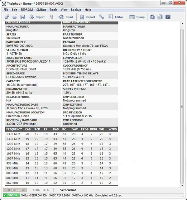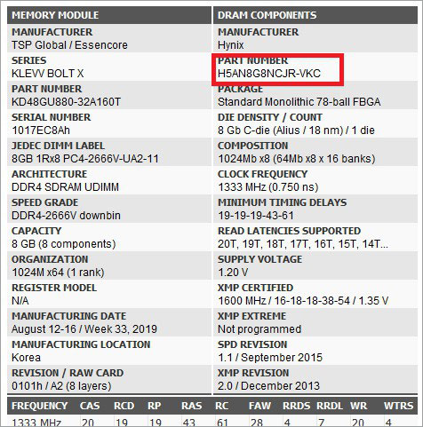 9、使用台风检测颗粒编号为“H5AN8G8NCJR-VKC”,确实为CJR颗粒。其中最后三位的颗粒编码规则 TFC-2133 ,UHC-2400 ,VKC-2666 , XNC-3200。VKC对应2666和标称值一致;