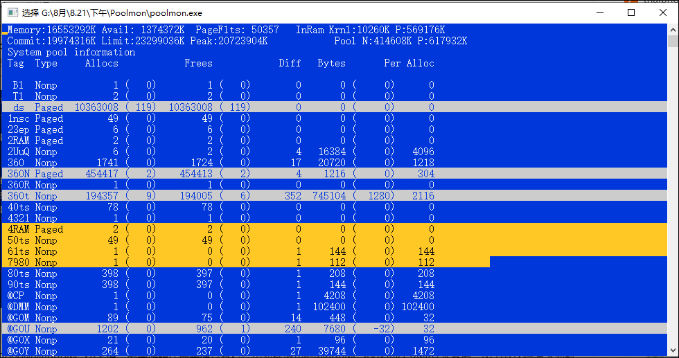 PooMon标头显示总分页和非分页池字节数。列显示每个池标记的池用法。屏幕每隔几秒钟自动更新一次。例如: