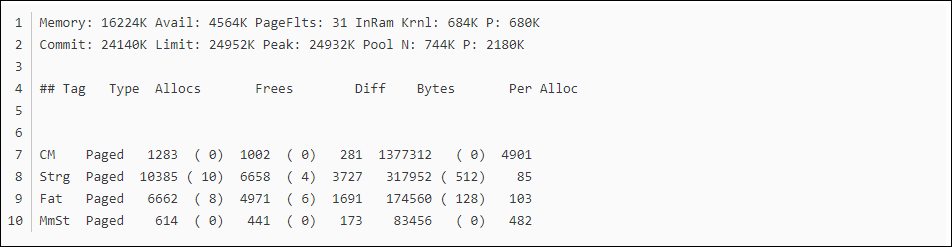 poolmon /g "C:iProgram Files (x86)Windows Kits110Debuggerstx64triagelpooltaq.txt