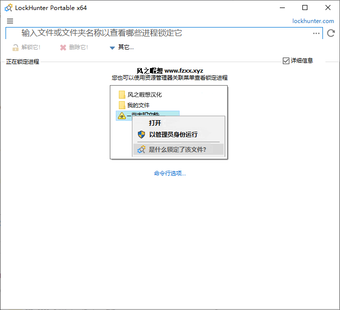 解锁猎人是一款专业的文件解锁工具,这款软件主要把锁定文件删除到回收站,方便的解除被锁定占用的文件,而且在它的界面上方可以看到被锁文件的路径,下方还会显示出当前哪些进程在锁定文件,可从硬盘中删除锁定进程文件,非常方便。另外,解锁猎人还支持的操作系统:Windows 2000\XP\2003\Vista\W7\W8 32\64 bit等操作系统,可显示文件正在被哪个进程锁定,非常的实用。