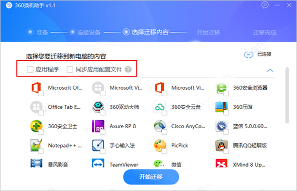 5、输入完成会直接进入下个步骤。这里您可以根据自己的需要来选择【搬家的软件、复制的资料】等等内容软件可以根据您的需要同将【软件配置、用户资料】一起迁,例如旧电脑中软件的登陆账号信息,软件内的个人设置。减少迁移后新电脑上的重复操作保持新旧电脑间软件的同步