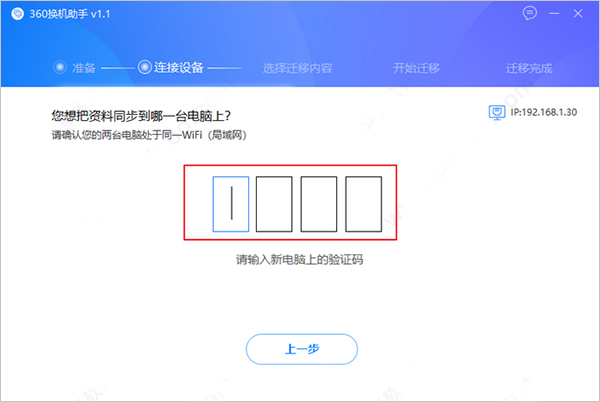 2、到这里程序会给您一个连接【验证码】,4个数字。记住这个验证码,我们现在回到【旧电脑】上完成后面的操作