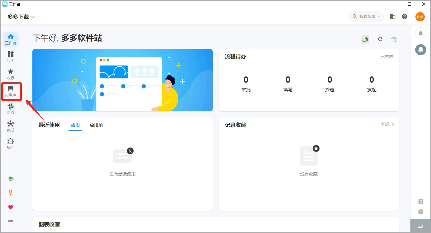 1、登录平台后,在首页左侧导航可以看到应用库,点击即可打开应用库的模板应用。