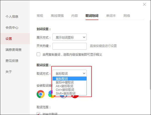 3、切换取词划词,下拉取此方式,选择你取词方式的按键;