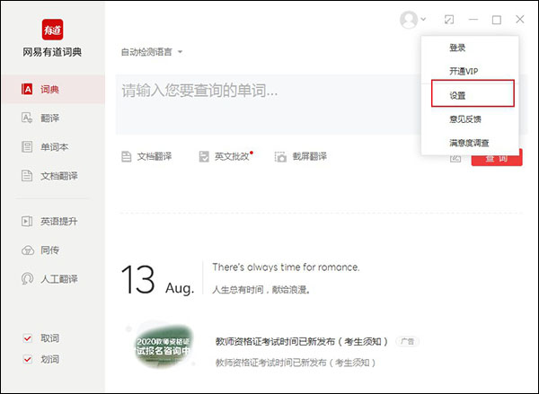1、首先我们打开有道词典,选择上方的标题栏,然后在弹出来的菜单中,选择设置;