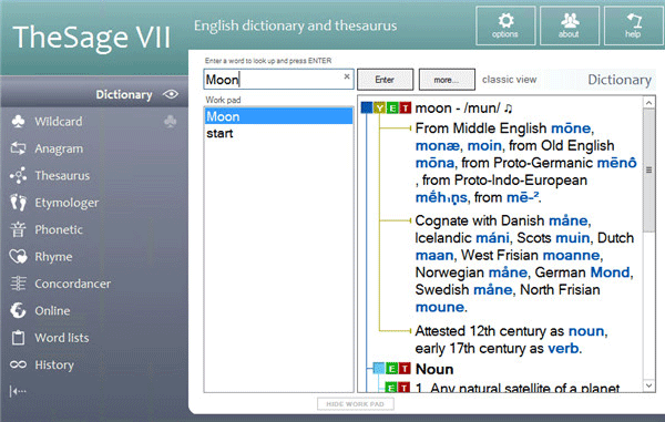TheSage是来自国外的一款非常简单实用,而且功能强大的电子词典。它可以被视为两个不同的系统:知识数据库和多工具界面。知识数据库由一个紧密结合的英文字典和词典组成。TheSage的索引包含大约25万字,其字典约315,000个,6万个词源,55,000个使用例子和75,000个语音翻译。TheSage的词表包含大约1,850,000个词和定义之间的关系,从同义词和反义词到高级词,低位词,别名,全同义等。多工具界面则允许用户以各种方式从知识数据库中提取和收集信息,这可以通过左侧导航面板中显示的工具来实现。