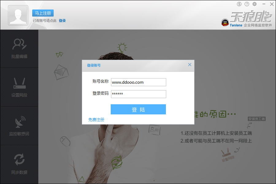 天狼眼企业网络监控软件(TLYManager)是专为中小企业设计的办公网络管理工具,功能强大又简单易用。它分为“控”和“录”两大板块,能禁止员工访问无关网站、聊天软件或使用非工作软件,同时还能详细记录必要的网络行为,比如聊天内容、邮件附件等,帮助企业更好地监控和管理员工的上网行为。