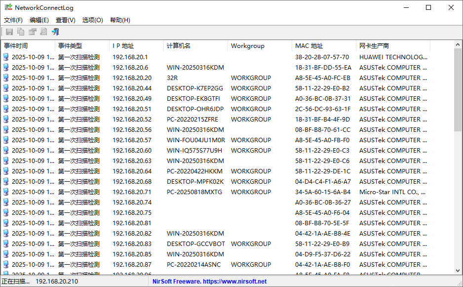 2、每次新设备连接或断开网络时,都会添加新的记录。