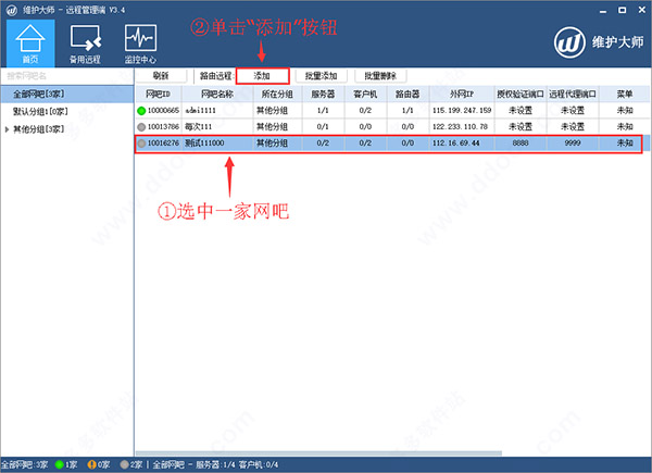 1、打开软件,选中一家网吧,点击上方的“添加”按钮