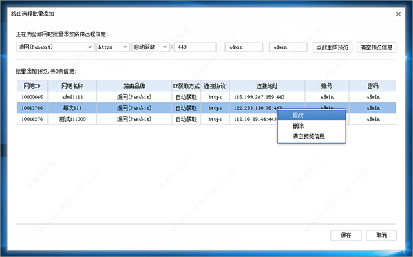 注:批量添加的IP是自动获取的,可在生成预览信息之后右键修改单条网吧的路由器信息,比如IP、账号密码,确认无误后再点“保存”按钮