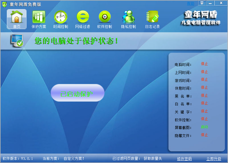 童年网盾官方版是一款免费的青少年网络安全监控软件,主要帮助家长引导孩子健康上网,预防网瘾和不良网络信息的影响。软件收录了全球5000多个非法网站,并实时更新,通过分析网页内容中的关键字来过滤非法信息,还能精确控制孩子的上网时间和游戏时间。界面简单友好,即使不懂电脑的父母也能轻松操作。