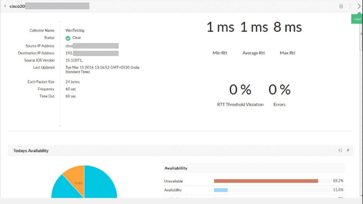OpManager通过利用Cisco IPSLA来帮助可视化您的WAN链接并解决WAN中断和性能问题,从而帮助进行无线网络监控。OpManager提供有关WAN链路延迟的详细信息,以改善较差的WAN性能。
