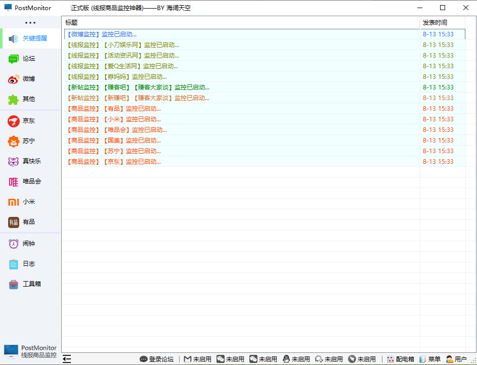PostMonitor官方版是一款功能强大,实用的线报商品监控神器,支持赚客吧、线报屋、赚客之家、抢抢网、鲁大客、赚客网、月云网等论坛帖子监控,爱Q生活网、dir28活动资讯网、寻宝阁、券妈妈等线报监控和京东、苏宁、国美、一号店等商品价格&库存等监控(支持邮件提醒)。