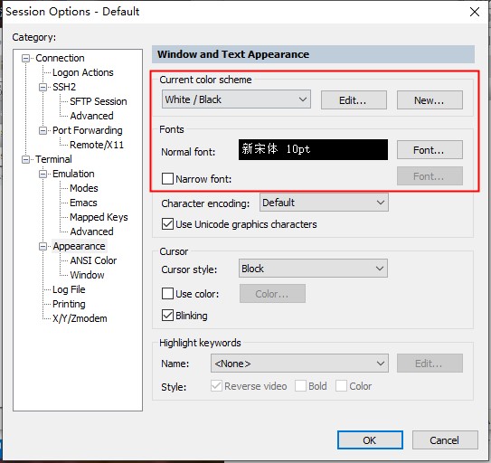 终端选择“Linux”, 勾选“ANSI颜色” 和 “使用颜色方案”,终端颜色配置请见下面后续。