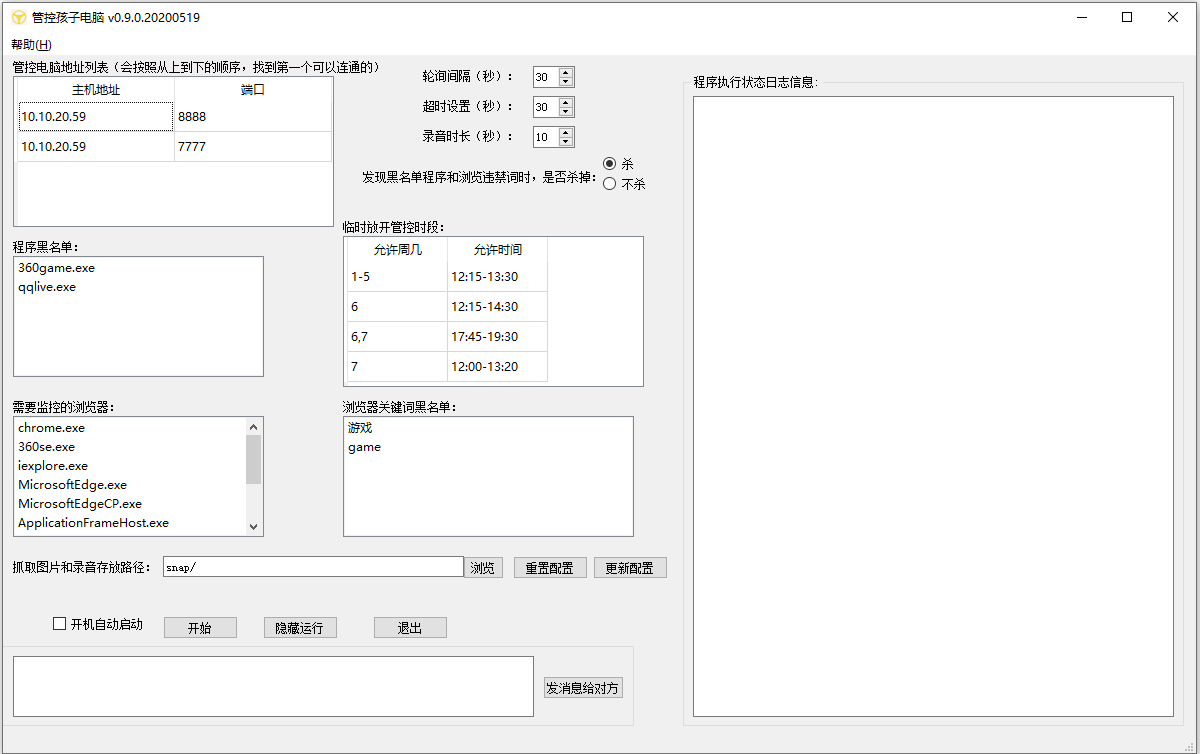 (2)放置在家长的电脑上运行,记得修改ChildControl.ini里面的孩子电脑ip地址