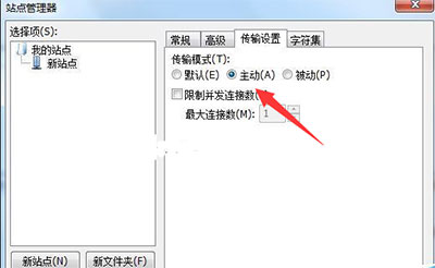 中要设置的站点连接,切换到“传输设置”选项,勾选“限制并发连接数”并设置“最大并发连接数”为1,勾选传输模式为“主动”。