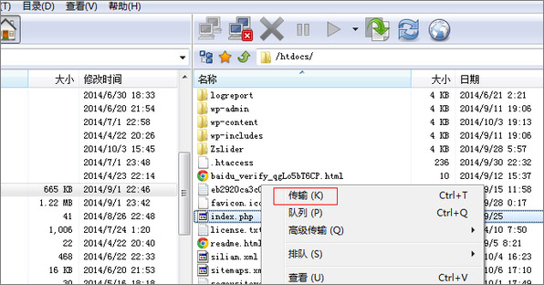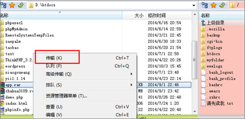 8、远程上传目录和本地上传文件确认好后,选中本地上传的文件后鼠标右键单击 “传输”。本地文件上传就实现了。也可以鼠标左键点中本地上传文件后不松手,直接拖拽到远程上传目录后松手即可实现本地文件上传。