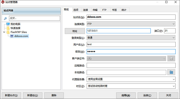 6、在常规面板,输入ftp空间的IP地址,端口,用户名称,密码,然后点击“应用”按钮,站点就设置好了。点击“连接”按钮,连接站点。也可以设置站点本地路径,当连接站点时,左侧的本地浏览视图会打开所设置的路径