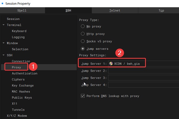 当你连接某台VPS网络不佳,还可以通过现有的任何机器作为跳板机登录,只需要编辑Session – SSH – Proxy – Jump Server 1进行选择即可。