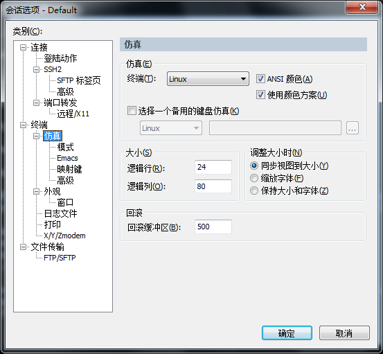 终端选择“Linux”, 勾选“ANSI颜色” 和 “使用颜色方案”,终端颜色配置请见下面后续…