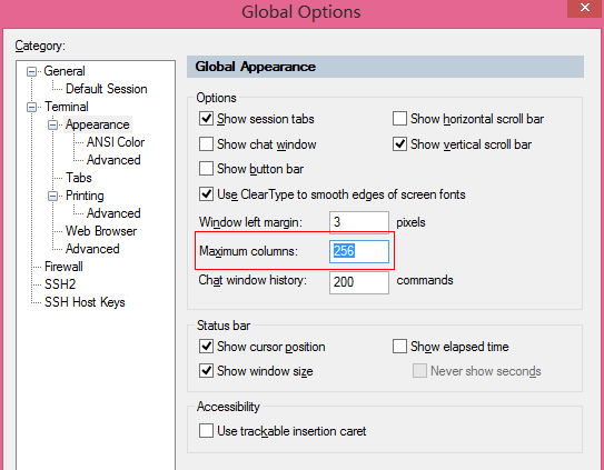 大显示器上若SecureCRT显示不能占满整个屏幕,可通过 Global Options/Terminal/Appearance/Maximum columns 来调整: