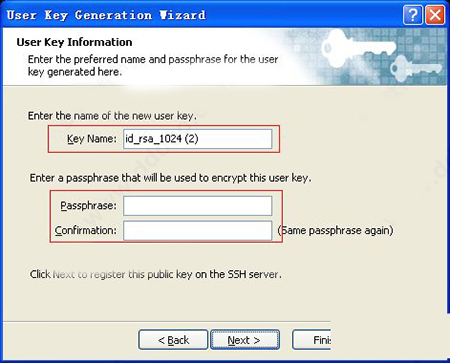 3、命名密钥名字和密码短语,不输入密码短语则无密码登录,建议输入短语咯,还是考虑安全。