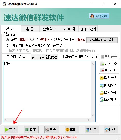 速达微信群发软件是一款高效而迅速的微信群发器,可以让使用者快速对微信好友、微信群进行消息自动群发操作,并可以通过使用随机发送问候语来让你所发送的每一条信息都不一样,且通过在禁发名单内添加好友账户,你可以让这些好友收不到你群发出去的消息。另外软件还支持群发消息定时以及群发内容循环等功能,欢迎免费下载。