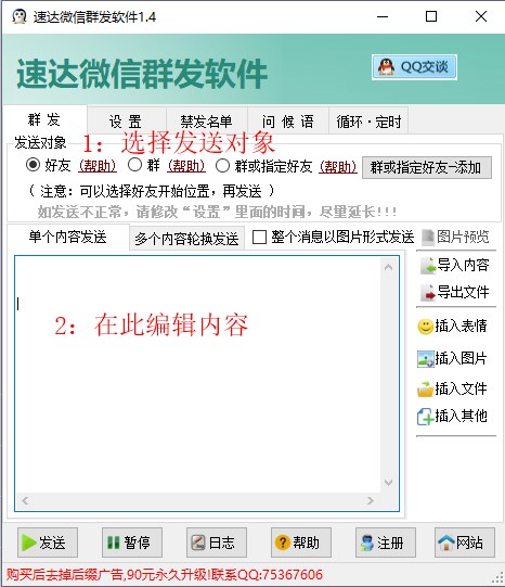 2、登陆成功以后打开速达微信群发软件,并先选择好发送对象,而后在编辑框里面编辑好内容。