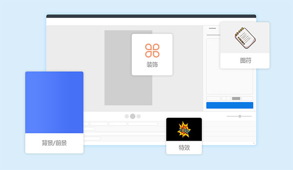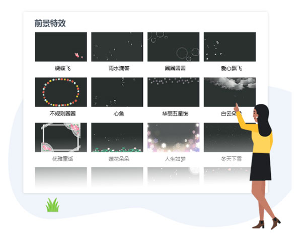 多种前景,如爱心、天空、植物等,满足各类场景需要;不同的装饰,如动植物、天气等, 美化视频画面;还有强大的特效,如爆炸、电光、表情等, 装点文字, 丰富动画视频内容。
