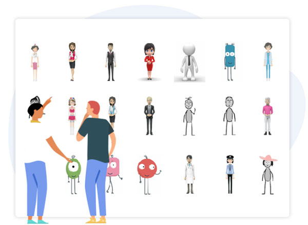 包含2D角色和3D角色,涉及多个行业:教师、 警察、医护、白领等。每一个角色都有各种动作/表情,您可根据文字的内容,配备相应的角色。