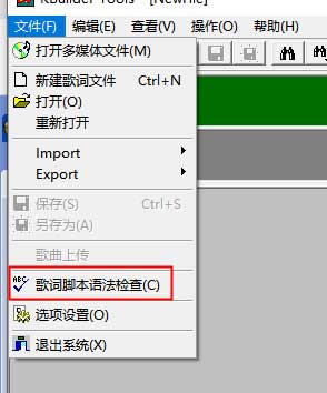 选菜单“文件(F) > 歌词脚本语法检查”,如果完全正确,程序窗体下方的状态栏会显示“歌词脚本语法正确!”,否则显示“*歌词脚本语法错误!”,光标定位到出错的那一行语句并以反白显示