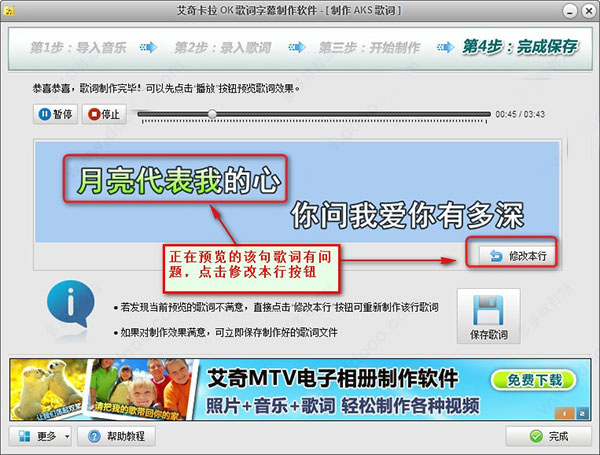--至此,一首歌曲的歌词已经制作好了。您可以点击界面右下角的 “完成” 按钮回到主界面,从新开始制作其他歌词。
