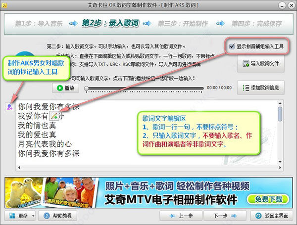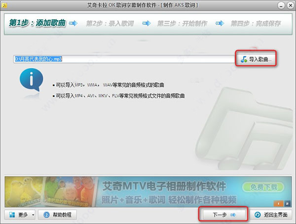 导入好歌曲文件后,点击“下一步”按钮进入录入歌词的步骤。
