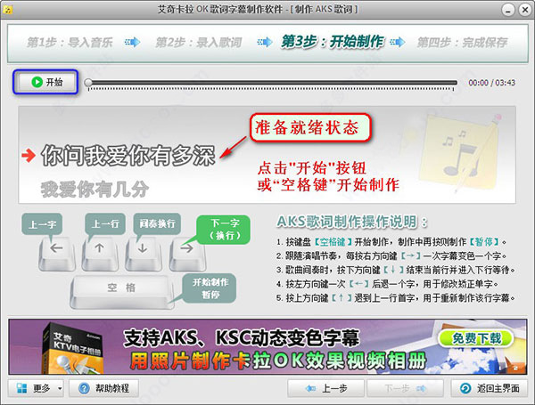 直接敲击键盘的“空格”键,或者用鼠标点击界面左上角的 “ 开始 ” 按钮将开始制作,这时软件将开始播放歌曲文件,现在就可以随着歌曲的演唱,轻轻松松制作AKS歌词了。