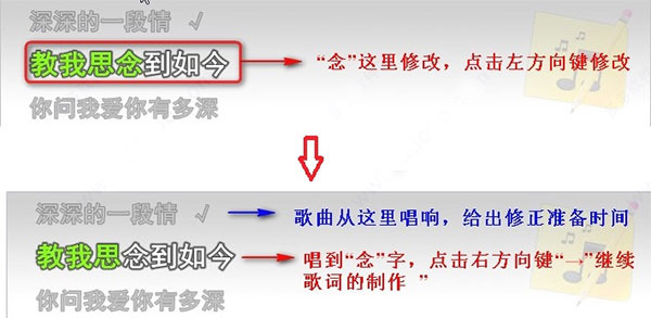 --【技巧 1 】当歌曲某行中的某个字制作的不好,只需敲击左方向键“←“即可后退一个字,用于单个字的修正。