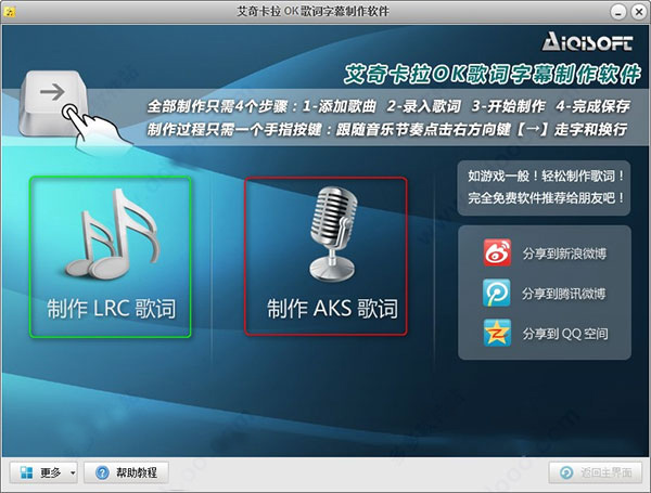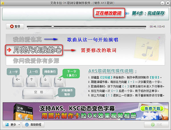 艾奇卡拉ok歌词字幕制作软件支持逐行显示的LRC格式的字幕,以及随着歌曲逐字变色的AKS歌词。