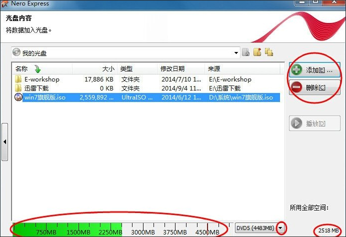 4、在添加文件时注意添加的文件所占光盘空间的大小,(注意一下:DVD选择DVD5),常用DVD空间为4.5G左右。详情如图标注所示: