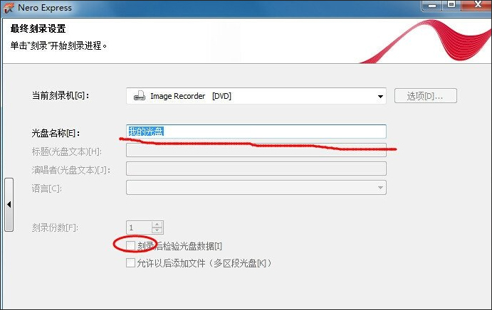 5、选择当前刻录机(如果不是外接光驱保持默认即可),输入光盘名称。勾选刻录后检验光盘数据(这个需要一段时间效验),点击刻录。
