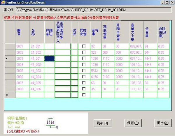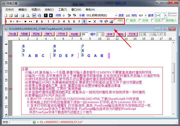 (1)输入时,首先输入一个乐器,接着只输入基本音符12345670X,不要管高低音时值线和节线。