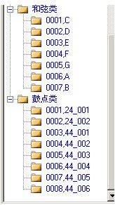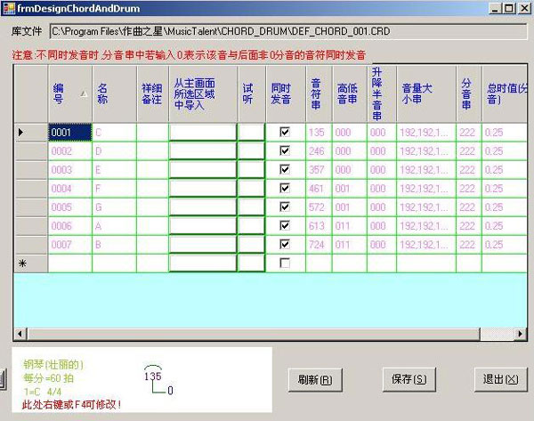 4、管理和弦库:可以自定义各类和弦,输入各弦编号,名称,从主画面中选择区域,然后按导入按钮,则音符串自动输入,如:C和弦假如为135,则提前在主画面中输入135,选中这三个后,在管理和弦画面点击该和弦对应的导入按钮。