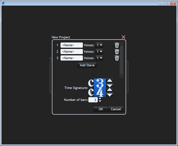 2、点“Add Stave”添加第二个板条而后在两个“”处命名梯级鼓和低音贝司,之后按OK后就能编谱。