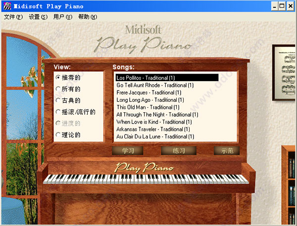 2、尽管软件本身已提供了相当多的练习曲目,你还可以导入任意标准MIDI文件并将其转换为MidiSoft PlayPiano自己的乐曲文件。这样,您就永远不必担心没有琴曲可练了。