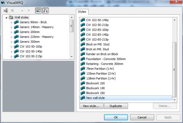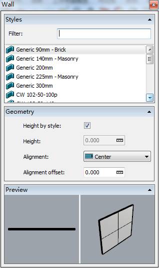 4、那么在这个属性框里我们可以选择不同的墙体样式,Visual ARQ会预先设定一些墙体参数供使用这选择,也可以自己设定,将会在第二篇推送中讲解。