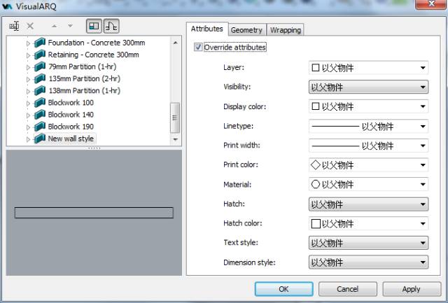 16、我们可以修改墙体的Attributes、Geometry、Wrapping三个属性参数。例如修改墙体的厚度与高度、填充样式、平面上的显示颜色、交接处的处理方式等等。属性修改完成后即可点击确定,在创建墙体面板里就能找到我们创建的新墙体样式了:
