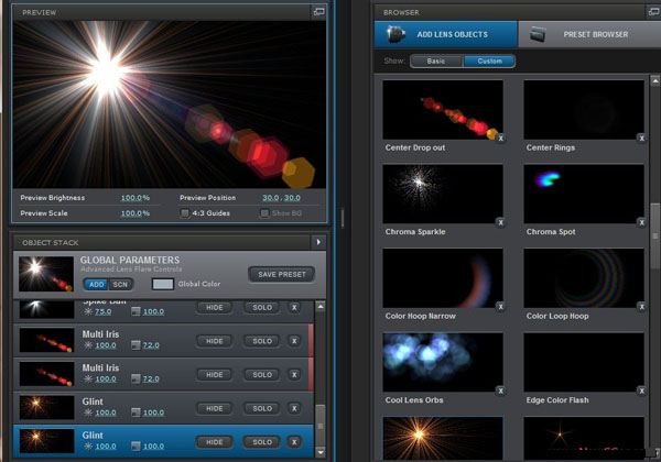 optical flares插件是游戏制作经常用到的一款非常强大的ae镜头光晕插件,该插件在控制性能、界面友好度以及效果等方面都比同类型的光晕插件强大并且实用。软件能够与AE灯光完美结合,能够实时显示的预设库,并支持实时显示纹理,支持多达32个通道的颜色,可以为用户提供非凡的ae镜头光晕。