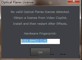 3、启动AE,调出Optical Flares,弹出下图,提示有机器的序号,一定要复制好此号,然后关闭AE