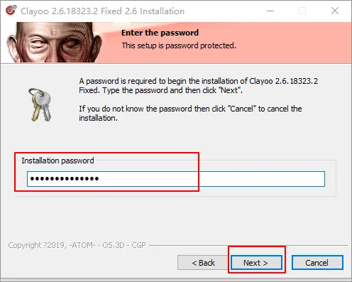 3、输入密码【ATOM&OS.3D@CGP】,点击【next】直到安装成功;