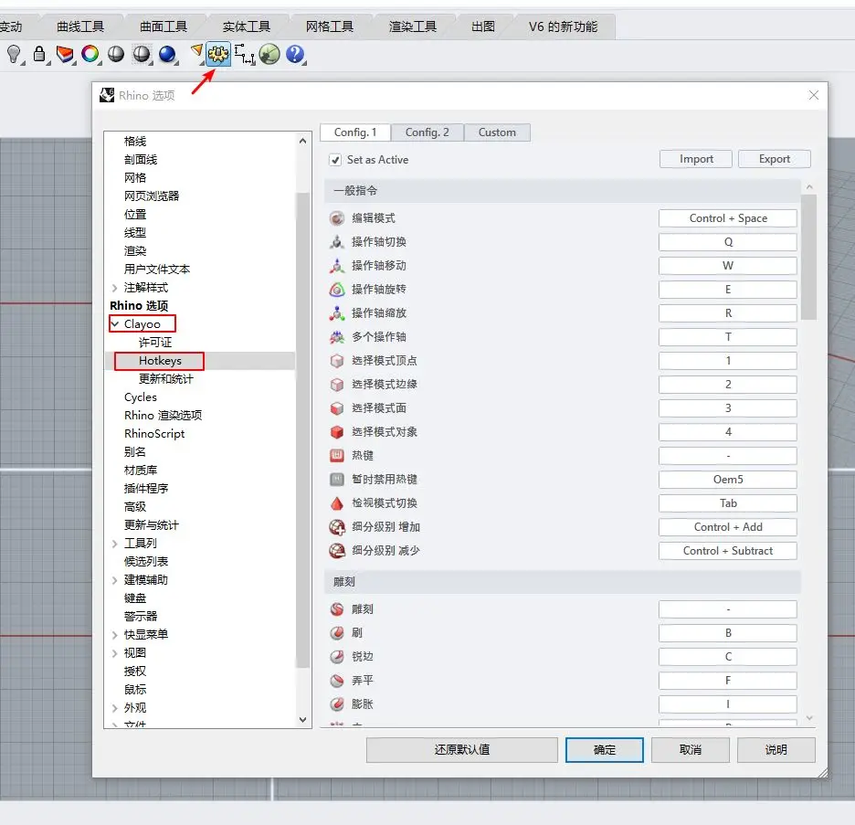 5、打开犀牛6,在选项 - 点击【Clayoo】选择【Hotkeys】就可以看见快捷键。