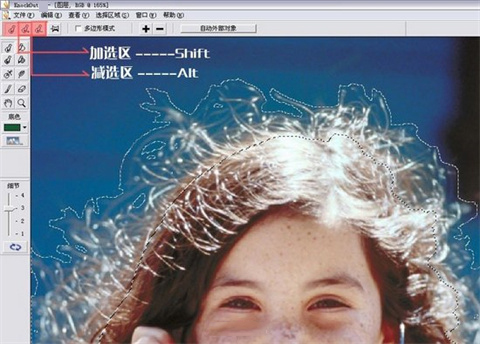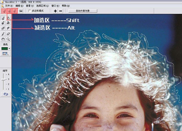 5、用对象外部 工具画出头发外部的选区,这一步要细一些。(shift:加选区 Alt:减选区)。